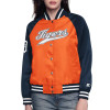 Crafted from premium satin fabric, the jacket features a striking navy blue and orange color combination that pays homage to the Tigers' iconic team colors. Its smooth, glossy finish adds a touch of sophistication to any casual look, whether you're at the ballpark or out on the town.