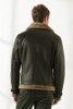 This is a very popular style in our Moss Green Shearling Leather Jacket. This jacket features a bomber style, front zip closure with leather tab detail and an elbow-length extended tab that protects your hands while wearing it. The lining of this shearling leather jacket is quilted, and it also has multiple pockets to keep you looking sharp all winter long.