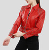 In this valentine, checkout this stylish Women’s Studded Red Leather Jacket is a fashionable and stylish choice for any woman looking to add a touch of edginess to her wardrobe. Made from high-quality genuine real leather with inside soft quilted viscose lining, this jacket is durable and built to last making it a worthwhile investment for any woman’s wardrobe. Its bold red color adds a pop of color to any outfit. The jacket gives it a casual and edgy look who want to make a statement with their outerwear. No matter how you style it, this jacket is sure to make a statement. Features are front zipper closure with shirt style collar. Additionally, two front pockets, two inside pockets with studded pattern design and long sleeves zipper cuffs. Overall, this high quality stylish Women’s Studded Red Leather Jacket is a fashionable and stylish choice for any woman looking to add a touch of chic to her wardrobe