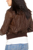 A women's brown leather moto bomber jacket is a type of outerwear garment made of brown leather and designed in the style of a bomber jacket. It typically features a zippered front, ribbed cuffs and possibly decorative elements such as pockets, hardware, and straps. This type of jacket is often associated with motorcycle culture and is worn for both style and protection while riding.