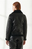 Women's Casual Black Shearling Leather Jacket is a great choice for business and casual occasions. It is versatile, stylish, and sophisticated enough to wear anywhere or around the house. The black fur shearling hood is practical and warm, while the shirt collar can be turned up or down as needed. This women's casual leather jacket features a lined V-neckline and cuffs with faux fur trim.